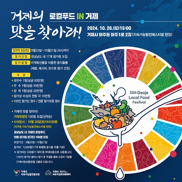 거제시 지속가능발전협의회는 ‘거제의 맛을 찾아라 로컬푸드 IN 거제’ 대회 참가자와 맛 평가단을 오는 21일까지 모집한다고 밝혔다.