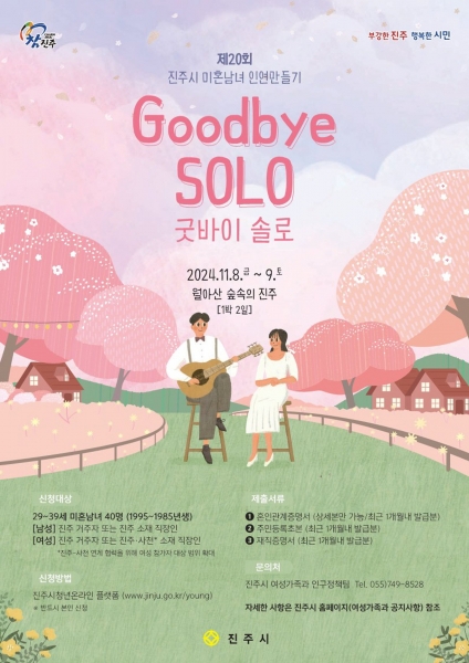 [아시아월드뉴스] 진주시는 결혼 적령기 미혼남녀를 대상으로 소중한 인연을 만날 수 있는 기회를 제공하고 결혼에 대한 긍정적인 인식을 높이기 위해 11월 8일부터 9일까지 월아산 숲속의 진주에서 ‘제20회 진주시 미혼남녀 인연 만들기 행사 굿바이 SOLO’행사를 개최한다고 밝혔다.