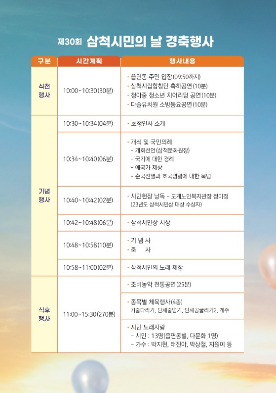 기념행사는 삼척시민합창단과 청아중 청소년 치어리딩, 다솔유치원 소방동요를 식전공연으로 시작하고 시민헌장 낭독, 삼척시민상 시상, 기념사 및 축사, 삼척시민의 노래 제창 등이 진행된다.