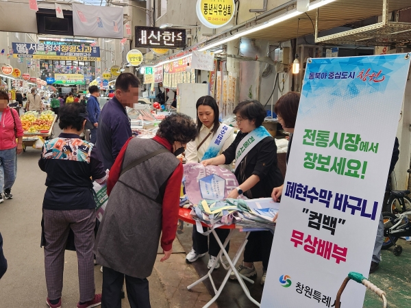 [아시아월드뉴스] 창원특례시는 마산어시장에서 지난 2일에 이어 10일에도 폐현수막으로 만든 장바구니 300장 무료 나눔 행사를 열고 대표 전통시장에서 매주 실시한다고 밝혔다.