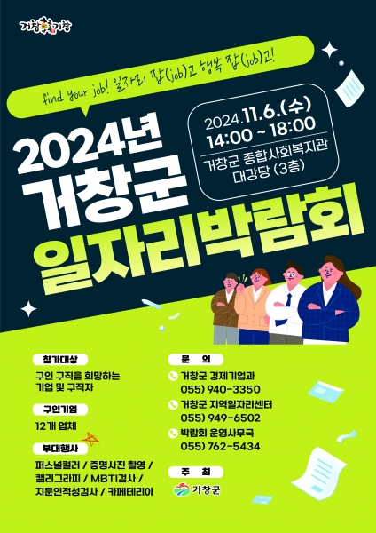 [아시아월드뉴스] 거창군은 오는 11월 6일 오후 2시 거창군 종합사회복지관 3층 대강당에서 ‘일자리 잡고 행복 잡고’라는 슬로건으로 2024년 거창군 일자리 박람회를 개최한다.