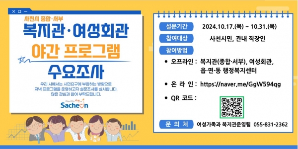 사천시 종합·서부사회복지관 관계자는 “시민요구에 부합하는 방향으로 저녁 프로그램을 운영하고자 설문조사를 실시하는 것”이라며 “많은 관심과 참여를 부탁드린다”고 당부했다.