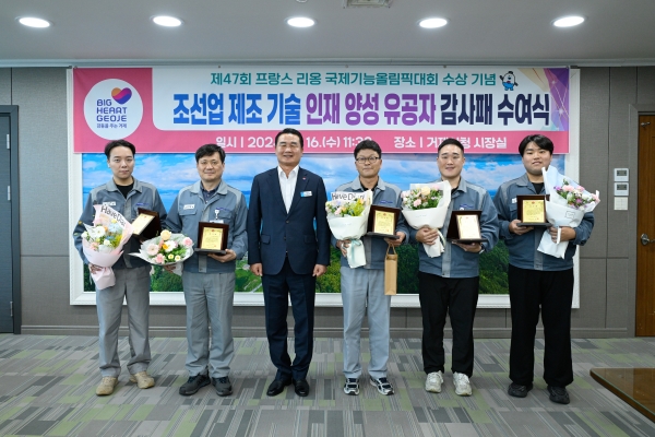 [아시아월드뉴스] 거제시는 16일 시장실에서 ‘제47회 프랑스 리옹 국제기능올림픽’에서 우수한 성적을 거둔 삼성중공업 기술연수원의 지도자들에게 감사패를 수여하며 격려했다.