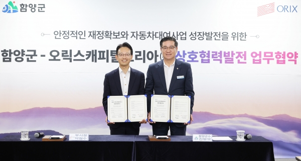 [아시아월드뉴스] 함양군은 16일 안정적인 군 재정 확보를 위해 자동차대여사업 법인 오릭스캐피탈코리아 주식회사와 업무협약을 체결했다.