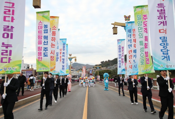이날 행사는 밀양 관아에서 야외공연장까지 이어지는 16개 읍면동 거리 퍼레이드를 시작으로 △식전공연 △기념식 △시민 한마당 축제 △열린음악회 순으로 진행됐다.