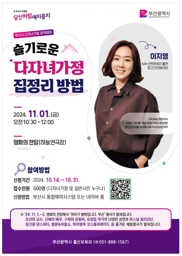 우미옥 시 여성가족국장은 “시는 전국 최초로 '다자녀가정의 날'을 지정해 매년 다양한 프로그램을 운영하고 있다”며 “이번 강연을 통해 다자녀가정에 유용한 정리수납 기술을 배우고 궁금한 점도 직접 물어볼 수 있는 뜻깊은 시간이 되었으면 한다”고 전했다.