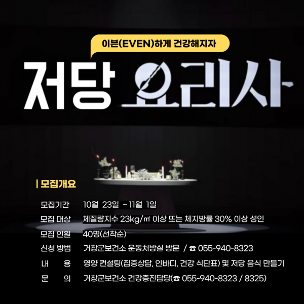 [아시아월드뉴스] 거창군은 10월 23일부터 11월 1일까지 8일간 비만예방관리사업 프로그램 ‘저당요리사’ 참여자 40명을 선착순 모집한다고 밝혔다.