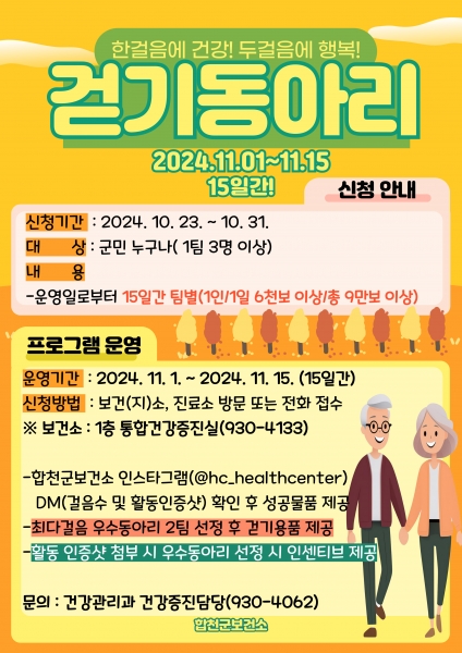 동아리 활동은 11월 1일부터 11월 15일까지 15일간 진행되며 1인당 하루 6천 보 이상, 총 9만 보 이상을 걷고 합천군보건소 인스타그램에 인증샷을 올리면 인증 확인 후 성공물품이 지급되는 방식이다.