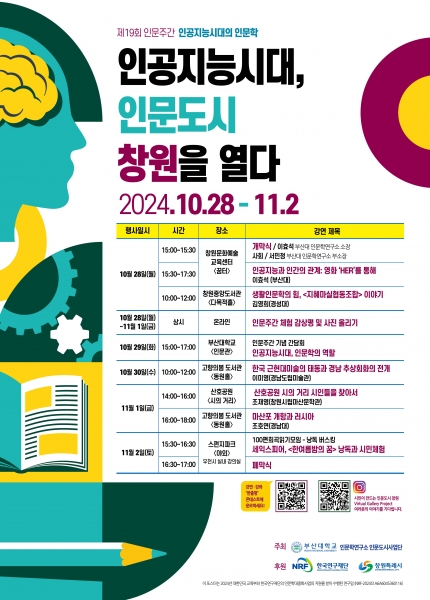 [아시아월드뉴스] 창원특례시는 부산대학교 인문학연구소와 함께 오는 28일부터 11월 2일까지 ‘인공지능의 시대, 인문도시 창원을 열다’를 주제로 창원문화예술교육센터, 창원중앙도서관, 고향의봄도서관, 스폰지파크 등에서 제19회 인문주간 행사를 개최한다고 밝혔다.
