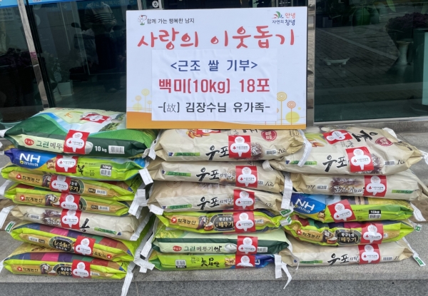 [아시아월드뉴스] 창녕군 남지읍행정복지센터는 故김장수씨의 배우자와 자녀들이 장례식을 치르는 동안 들어온 근조 쌀 10kg 18포를 어려운 이웃을 돕기 위해 기부했다고 23일 밝혔다.