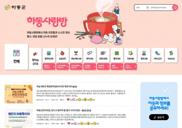 [아시아월드뉴스] 하동군에서 민선8기 새로운 소통 정책의 하나로 추진해 온 ‘하동사랑방’ 이 지난 2~9월 등록된 게시글이 3536건을 돌파하며 하동군의 대표 소통 창구로 자리매김하고 있다.