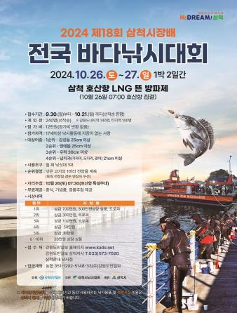 [아시아월드뉴스] 삼척시가 후원하고 강원도민일보가 주최, 삼척시낚시협회가 주관하는 “제18회 삼척시장배 전국바다낚시대회”가 10.26.~10.27. 2일간 전국 낚시동호인 255명이 참가한 가운데 호산항 외곽방파제에서 개최된다.