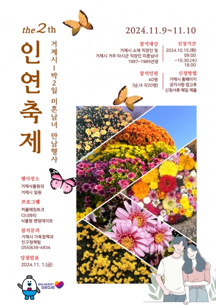 1985년 ~ 1997년생 미혼남녀로 거제시 소재 직장인 및 거제시 거주 타시군 직장인이면 누구나 신청 가능하며 참가비는 무료다.