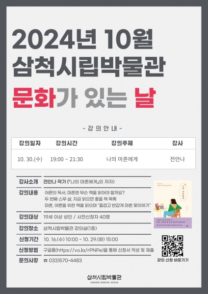 [아시아월드뉴스] 삼척시립박물관은 오는 10월 30일 ‘문화가 있는 날’을 맞아 강의를 진행한다.