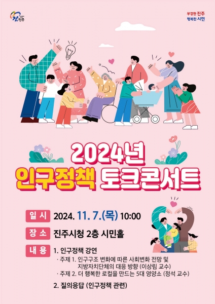 [아시아월드뉴스] 진주시는 11월 7일 오전 10시 시청 2층 시민홀에서 ‘진주시 인구정책 토크콘서트’를 개최한다.