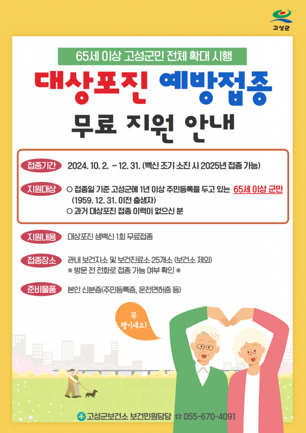 앞서 군은 ‘고성군 대상포진 예방접종 지원 조례’를 일부 개정해 고성군에 1년 이상 주민등록 주소를 두고 있는 65세 이상 군민이면 누구나 접종할 수 있도록 했으며 9월부터 군민 및 각 읍면을 대상으로 안내 및 홍보를 실시했다.
