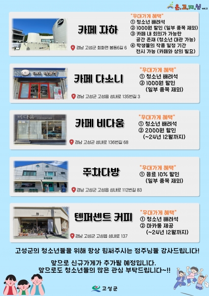 이상근 고성군수는 “작년에 이어 올해도 청소년 배려를 위해 동참한 청소년 우대가게 점주님들에게 감사의 인사를 전하며 지역 내 청소년들의 건전한 성장을 위해 아낌없이 지원할 방안을 마련하겠다”고 전했다.