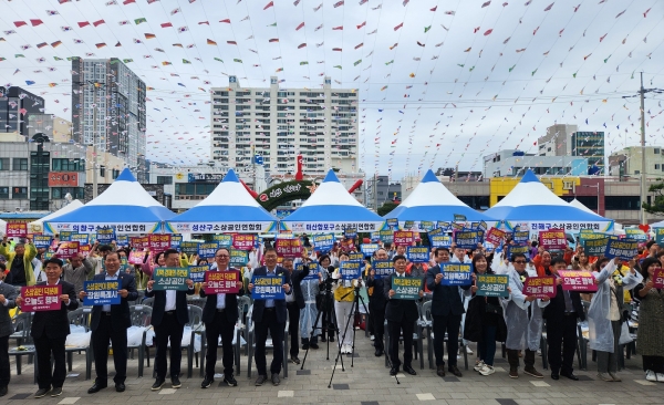 이날 소상공인들은 경제침체로 닥친 시련을 함께 이겨내자는 결의를 담아 카드섹션 퍼포먼스도 실시했다.