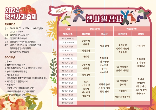 ‘2024 정선사과축제’는 단맛이 풍부하고 장기간 보관이 가능한 부사 품종이 출하되는 시기에 개최되어 고랭지 정선사과를 즐길 수 있으며 가족과 함께 국민고향정선의 청정 자연속에서 완연한 가을을 느낄 수 있는 명품 축제로 진행될 예정이다.