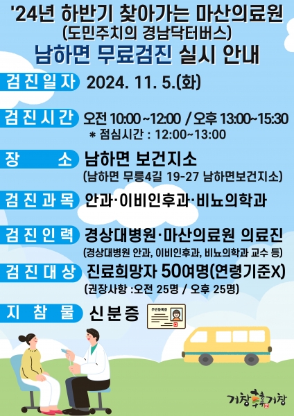 ‘찾아가는 마산의료원 무료 검진사업’은 안과, 이비인후과, 비뇨의학과가 없는 면 지역주민을 대상으로 경상국립대병원, 마산의료원 의료진이 직접 방문해 무료 검진을 진행하는 경남도의 사업이다.