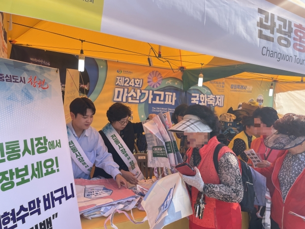 창원 대표축제인 마산가고파국화축제장 방문객을 대상으로 폐현수막 바구니 900장을 무료 나눔과 더불어 일회용품 줄이기와 전통시장 이용 활성화 캠페인을 펼쳤다.