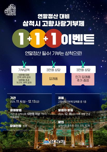 [아시아월드뉴스] 삼척시는 연말정산 기간을 앞두고 ‘삼척시 고향사랑기부제 1+1+1 이벤트’를 진행한다고 밝혔다.