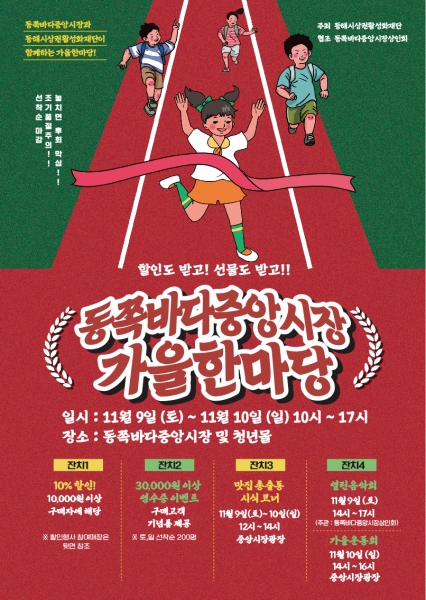 ‘2024년 동쪽바다중앙시장 가을한마당’은 동쪽바다중앙시장과 청년몰이 함께하는 행사로 전통시장의 정겨운 분위기 속에서 할인 혜택을 누리며 먹거리, 볼거리, 체험 등을 즐길 수 있는 행사와 함께 소비자에게 감사의 마음을 전하며 경제활력을 지지하기 위한 다양한 이벤트도 열린다.