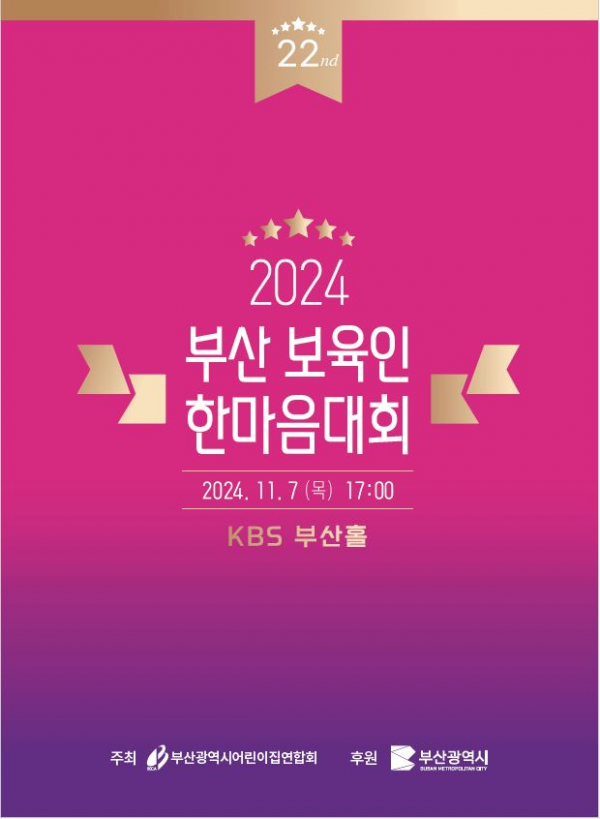 [아시아월드뉴스] 부산시는 오늘 오후 5시 케이비에스 부산홀에서 ‘제22회 부산 보육인 한마음 대회’ 가 열린다고 밝혔다.