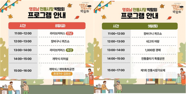 이준승 시 행정부시장을 비롯한 주요 인사가 참석한 가운데 개막을 축하하고 전통시장 활성화에 이바지한 부산과 전남의 전통시장 상인들의 노고에 감사를 전하는 유공 상인 시상이 이뤄질 예정이다.