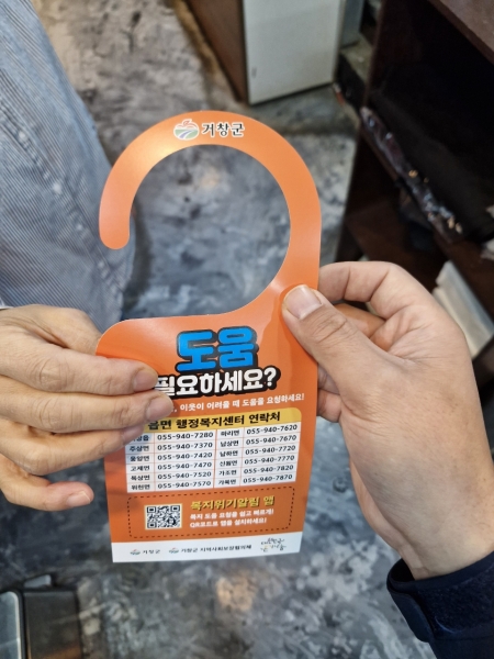 [아시아월드뉴스] 거창군은 7일 동절기 복지사각지대 발굴과 복지 안전망 지원체계 강화를 위해 ‘도움이 필요하세요?’라는 문구를 담은 문고리형 홍보물을 제작해 위기가구 발굴·지원에 나섰다.
