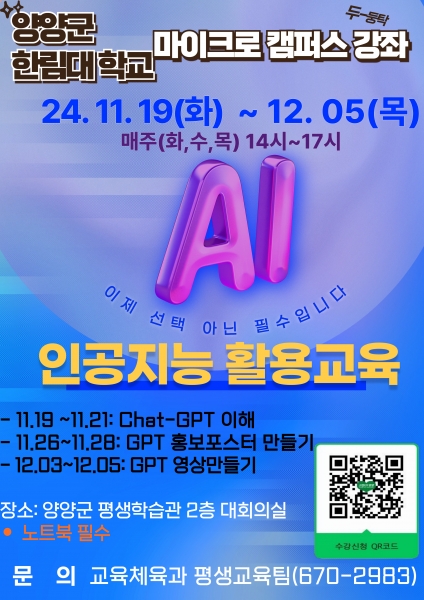 [아시아월드뉴스] 양양군이 한림대학교와 추진 중인 마이크로캠퍼스 사업의 일환으로 군민 대상 인공지능 활용 교육프로그램을 개설하고 3개 과정별 수강생 30명씩을 오는 11월 18일까지 모집한다.