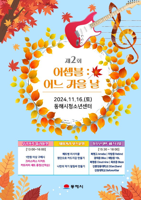[아시아월드뉴스] 동해시는 오는 16일 청소년센터에서 밴드페스티벌 ‘제2회 어셈블: 어느 가을 날’을 개최한다고 밝혔다.