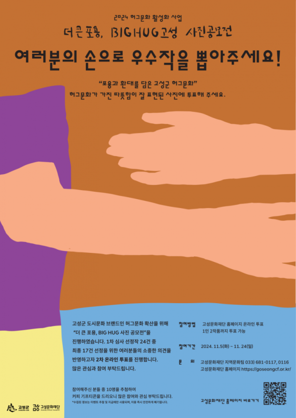 이번 공모전은 고성군의 허그 문화를 널리 알리고 지역사회에 포용과 환대의 문화를 확산하기 위해 기획됐으며 2차 심사는 1차 심사 선정작을 대상으로 고성군민이 직접 참여해 최종 수상작을 결정하는 온라인 군민투표로 고성문화재단 누리집을 통해 참여할 수 있다.