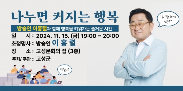 [아시아월드뉴스] 고성군은 오는 11월 15일 오후 7시, 고성문화의집 문화관람실에서 유명 MC이자 개그맨으로 활약해온 방송인 ‘이홍렬’ 씨를 초청해 특별강연 ‘나누면 더 커지는 행복’을 개최한다.