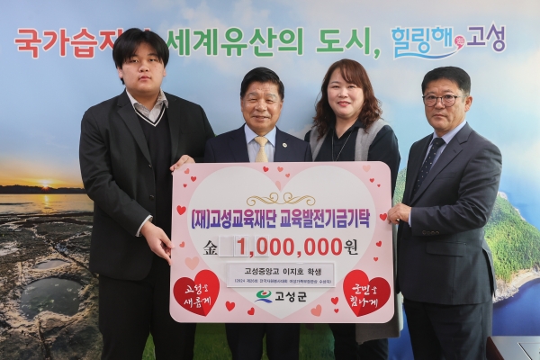 최상림 고성교육재단 이사장은 “여성가족부 장관상 시상금을 청소년 활동 활성화를 위해 기탁해준 이지호 학생의 마음에 깊은 감동을 받았다”며 “소중한 기탁금은 고성군 아동·청소년들을 위해 필요한 곳에 잘 사용하도록 하겠다”고 전했다.