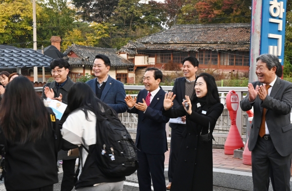 2025년도 대학수학능력시험일인 14일 창녕지역 시험장인 창녕여자고등학교를 찾은 성낙인 창녕군수가 수능 응시생을 응원하러 나온 학생들과 기념사진을 찍고 있다.