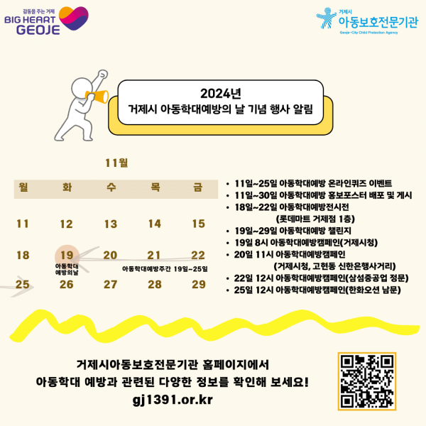 [아시아월드뉴스] 거제시는 11월 19일 ‘아동학대예방의 날’의 날을 맞아 거제시아동보호전문기관과 함께 아동 보호와 학대 근절에 대한 지역사회의 공감대 형성을 목표로 다채로운 캠페인과 행사를 전개한다고 밝혔다.