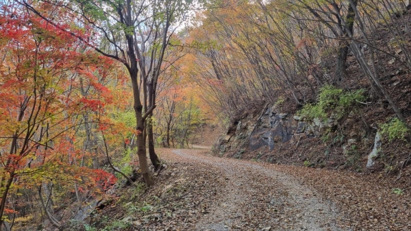남해힐링숲타운에서 순천바위까지 이르는 약 4.5km의 임도에는 단풍이 곱게 내려앉았으며 숲길에서 바라보는 내산저수지 일원의 가을풍광도 일품이다.