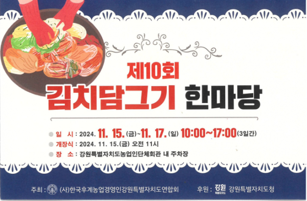 [아시아월드뉴스] 한국후계농업경영인 강원특별자치도연합회는 11월 15일부터 3일간 강원특별자치도 농업인단체회관에서 '제10회 김치담그기 한마당' 행사를 개최한다.