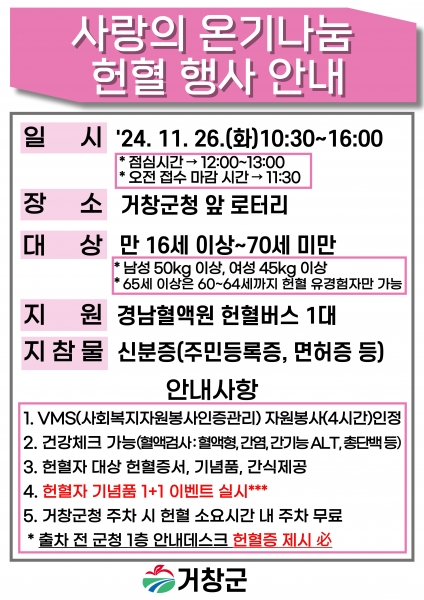 [아시아월드뉴스] 거창군은 다가오는 동절기에 혈액 수급 안정화를 위해 오는 26일 오전 10시 30분부터 오후 4시까지 군청 앞 로터리에서 ‘4분기 사랑의 온기 나눔 헌혈 행사’를 추진한다.
