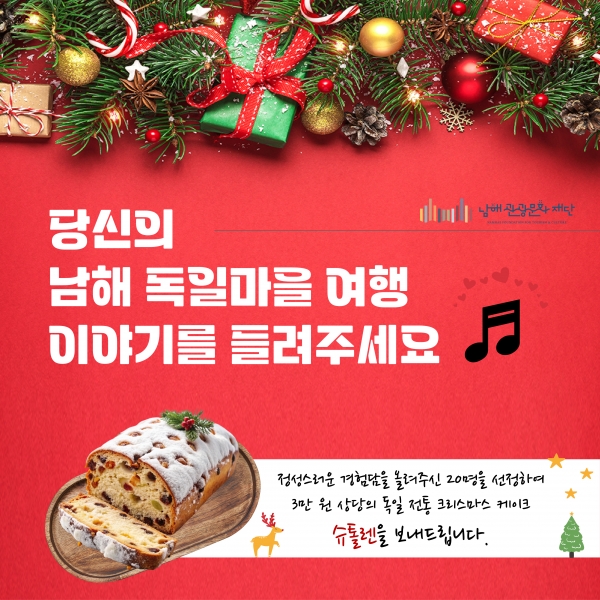 남해관광문화재단 조영호 본부장은 “여권 없이 올 수 있는 남해독일마을에 대한 여행스토리를 통해 독일을 대표하는 성탄절 빵을 나눈다는 취지가 다정하다”며 “정성스런 여행후기를 통해 가장 가까이에서 느낄 수 있는 독일 남해독일마을에 대한 추억 하나가 보태지길 바란다”고 말했다.
