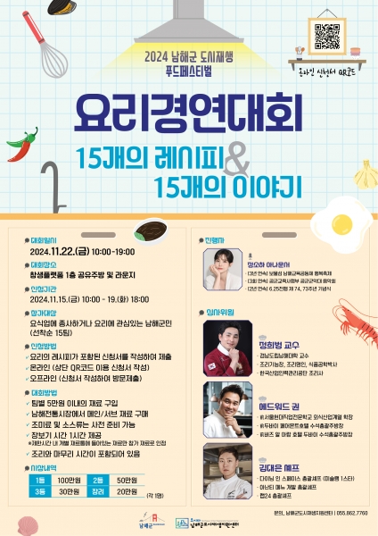 요식업에 종사하거나 요리에 관심 있는 남해군민 누구나 참여할 수 있으며 오는 15일부터 19일까지 온라인 및 방문 신청을 받는다.