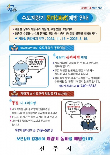 진주시는 본격적인 추위가 시작되는 겨울철을 맞아 상수도 시설 동파에 대비하고 안정적인 수돗물 공급과 신속한 시설복구를 위해 동절기 종합대책을 수립했으며 11월부터 내년 3월까지 종합상황반을 운영한다.