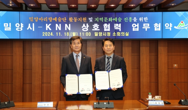 [아시아월드뉴스] 밀양시는 지난 18일 시청 소회의실에서 ㈜케이엔엔과‘밀양아리랑예술단 활동 지원 및 지역 문화예술 활성화를 위한 업무협약’을 체결했다.