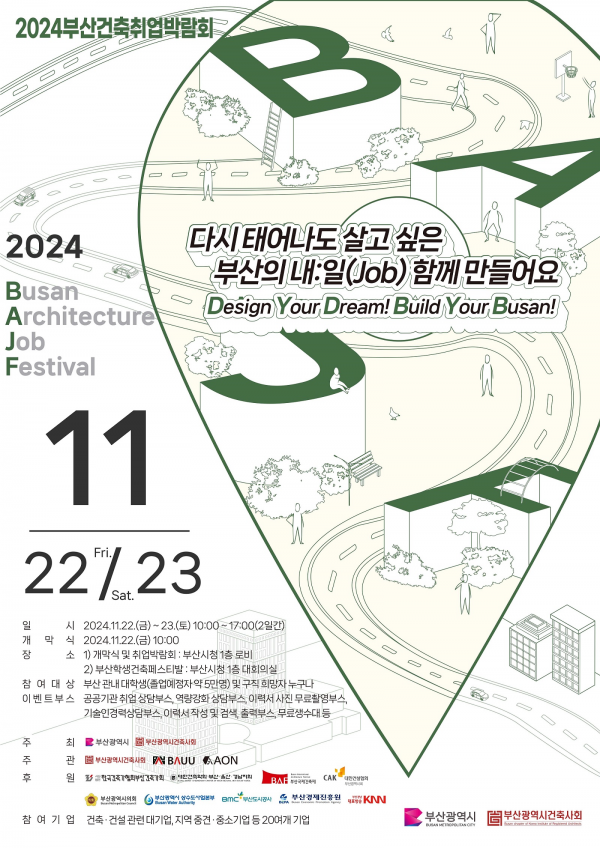 이번 ‘부산 청년 건축가를 위한 건축 취업박람회’는 '다시 태어나도 살고 싶은 부산의 내:일 함께 만들어요'라는 주제로 건축·건설 관련 대기업, 지역 중견·중소기업 등 20여 개 기업의 공간이 마련된다.