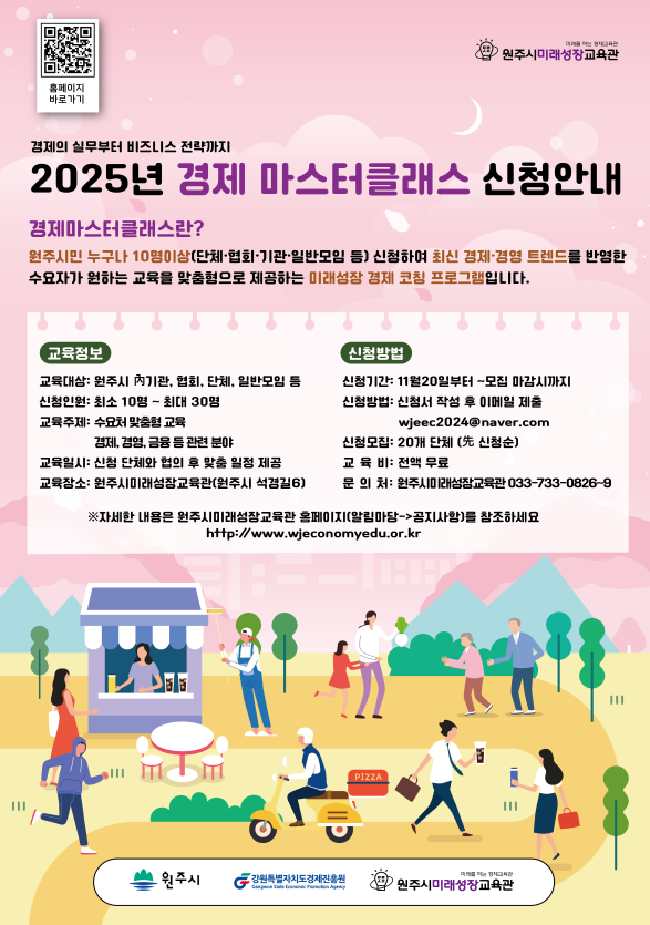 [아시아월드뉴스] 원주시미래성장교육관에서는 시민들의 경제적 성장을 돕기 위해 소통형 경제교육인 ‘2025년 경제마스터클래스’ 대상자를 모집한다.