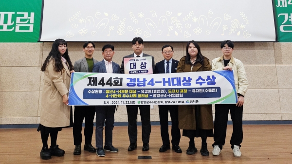 [아시아월드뉴스] 함양군은 22일 마산로봇랜드에서 개최된 제44회 경남4-H대상 시상식에서 함양군4-H연합회 유강현 회장이 청년4-H부문 대상 수상자로 선정됐다고 밝혔다.
