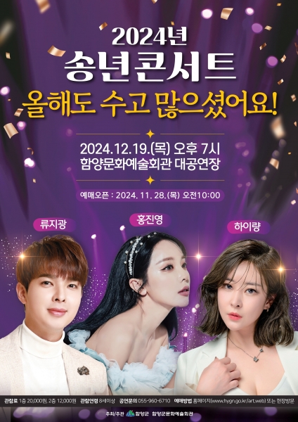 이번 송년 콘서트는 2024년 한 해를 마무리하며 새로운 시작을 준비하는 군민들과 함께 대한민국 트로트 대세 가수들이 어우러져 즐겁고 흥겨운 시간을 나누고 심신을 위로하며 힐링의 순간을 선사하기 위해 기획됐다.