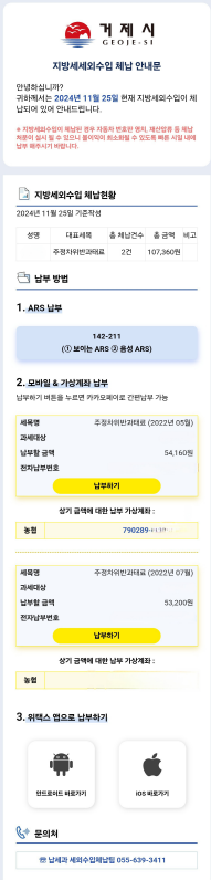 [아시아월드뉴스] 거제시는 25일 체납 세외수입 납부편의와 효율적인 징수를 위해 모바일 체납안내 서비스를 시행했다.