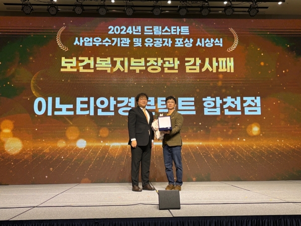 이번 드림스타트 사업보고대회에서 이노티안경콘택트 합천점 송근호 대표는 드림스타트 후원, 연계 등 협력사업 유공자로서 장관감사패를 수상했다.